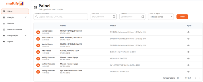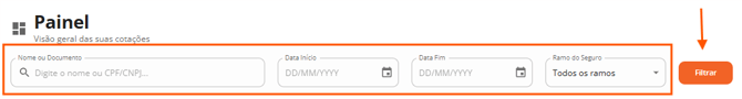 No topo da tela, você pode pesquisar por Nome ou documento do segurado, intervalo das datas que a cotação foi realizada e pelo ramo. Após informar o filtro desejo, clique no botão