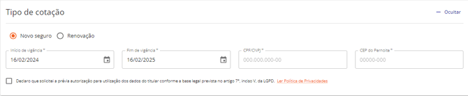 - Somente será possível a cotação com a caixa de autorização de uso de dados selecionada.