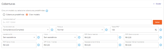 6) Por fim, no campo das coberturas, caso vocês utilizem um padrão de coberturas, é possível salvar e adiantar mais este processo em cotações futuras, clicando no botão verde abaixo dos campos.