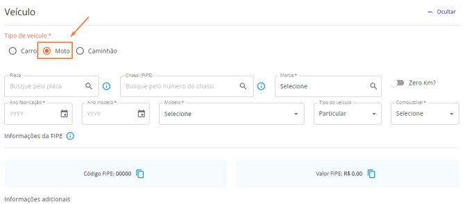 4) Os campos a seguir abordam os dados do veículo, é aqui que selecionamos o "tipo do veículo: Moto". É fundamental preencher o máximo possível destas informações para a Seguradora ter mais material de análise.