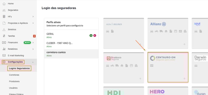1) Vamos acessar Configurações > Logins Seguradoras > Clique sobre a Centauro-on