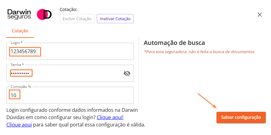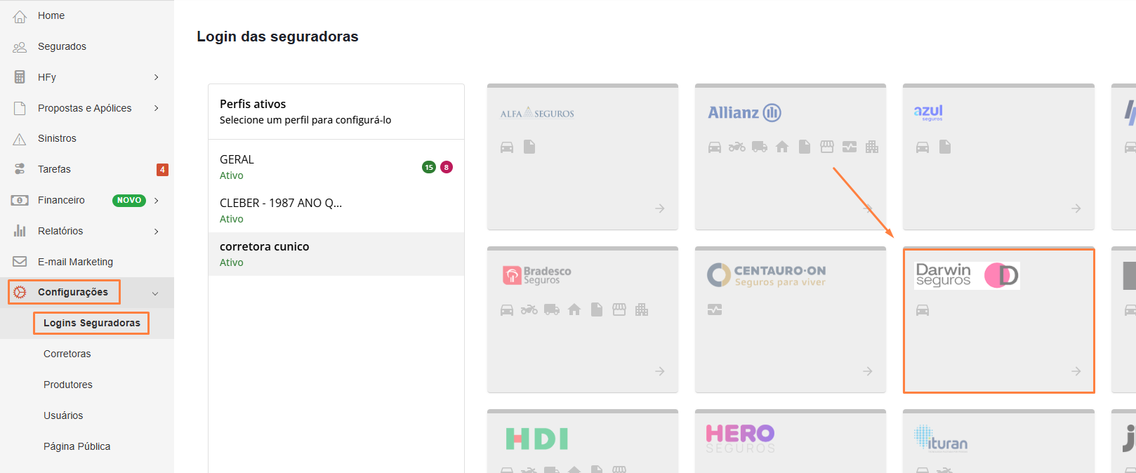 Para configurar o login da seguradora, acesse Configurações > Logins Seguradoras > Darwin