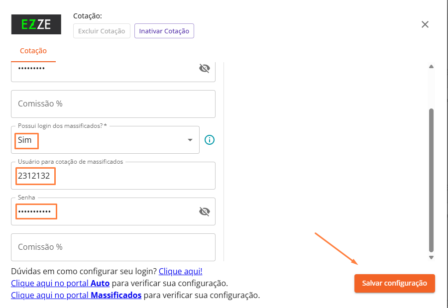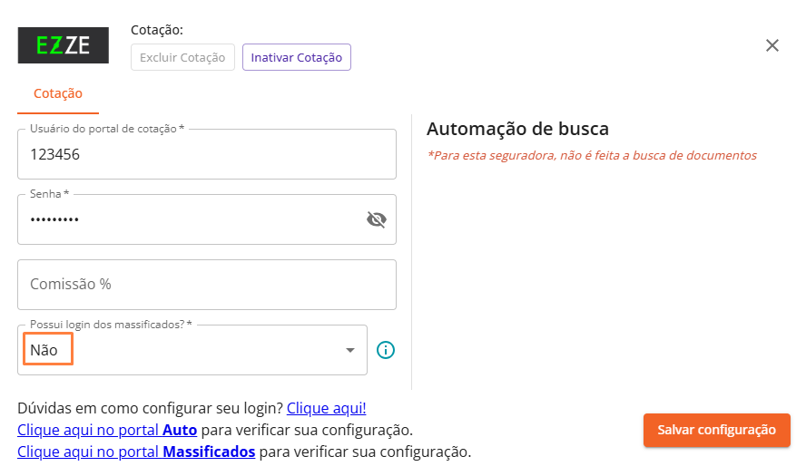 4) Na Segfy, acesse: Configurações > Logins Seguradoras > Ezze > Selecione 'sim' para a opção de login massficados > Preencha o login e senha do site acima > Salvar