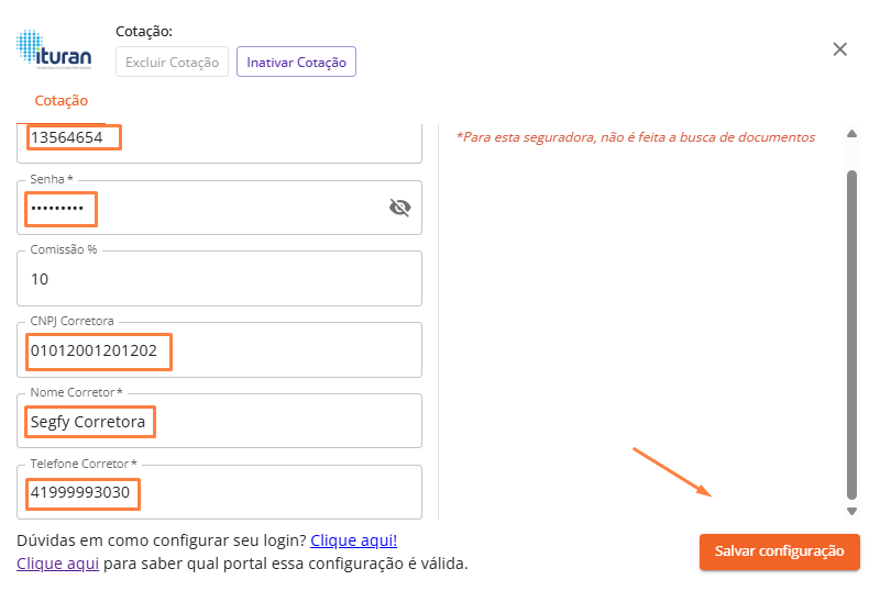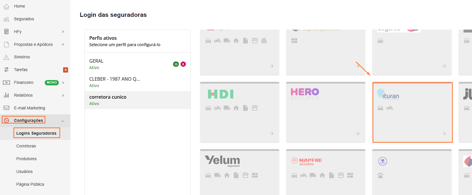 1) Acesse o Segfy, vá em Configurações > Logins Seguradoras e clique no card da Ituran.