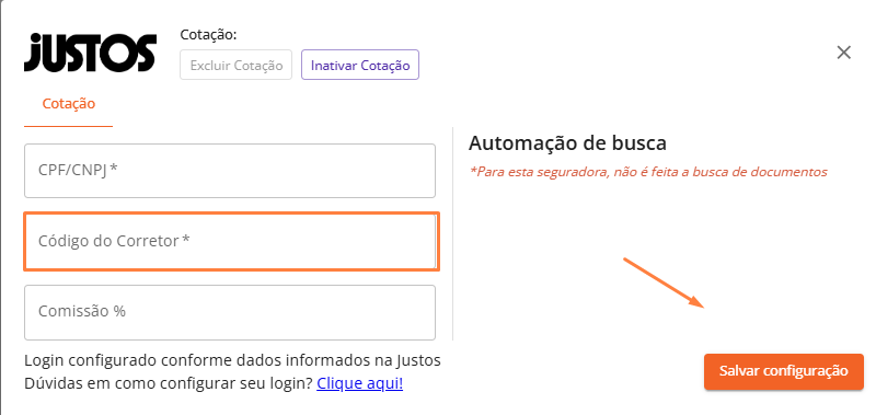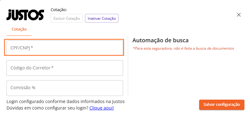 1) Para configurar o login da seguradora, acesse Configurações > Logins de Seguradoras > Justos e preencha o campo com o seu CPF ou CNPJ, conforme o dado que você utiliza para acessar a Justos: