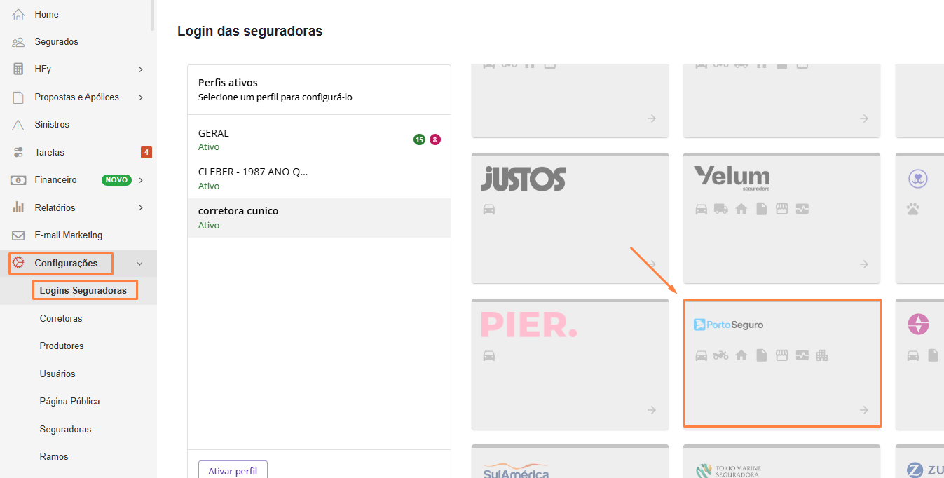 1) Vamos acessar Configurações > Logins Seguradoras > Clique Sobre a Porto