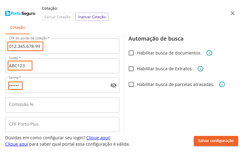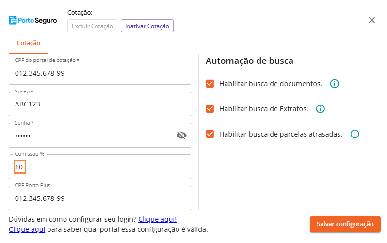 Aqui vamos usar você a configurar o login e senha para cotar na seguradora Porto Seguro. Vale pontuar que ao configurar o login de cotação para um Porto, o mesmo já é automaticamente criado para um Azul.
