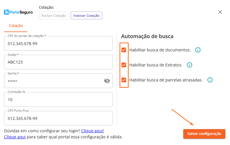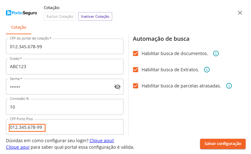 6) Prontinho, seus dados da Porto e Azul (para cotação) já estão configurados e prontos para uso.