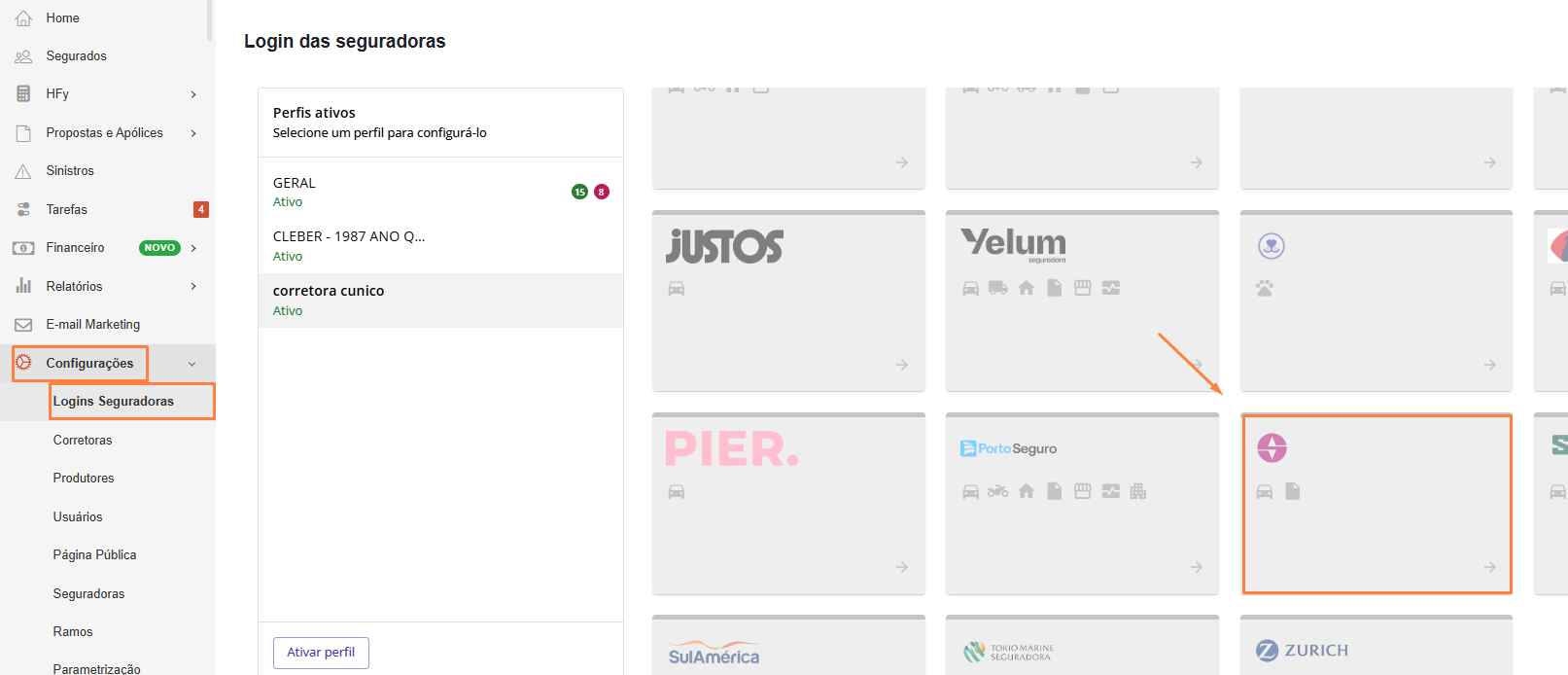 1) Vamos acessar Configurações > Logins Seguradoras > clique sobre a Sompo: