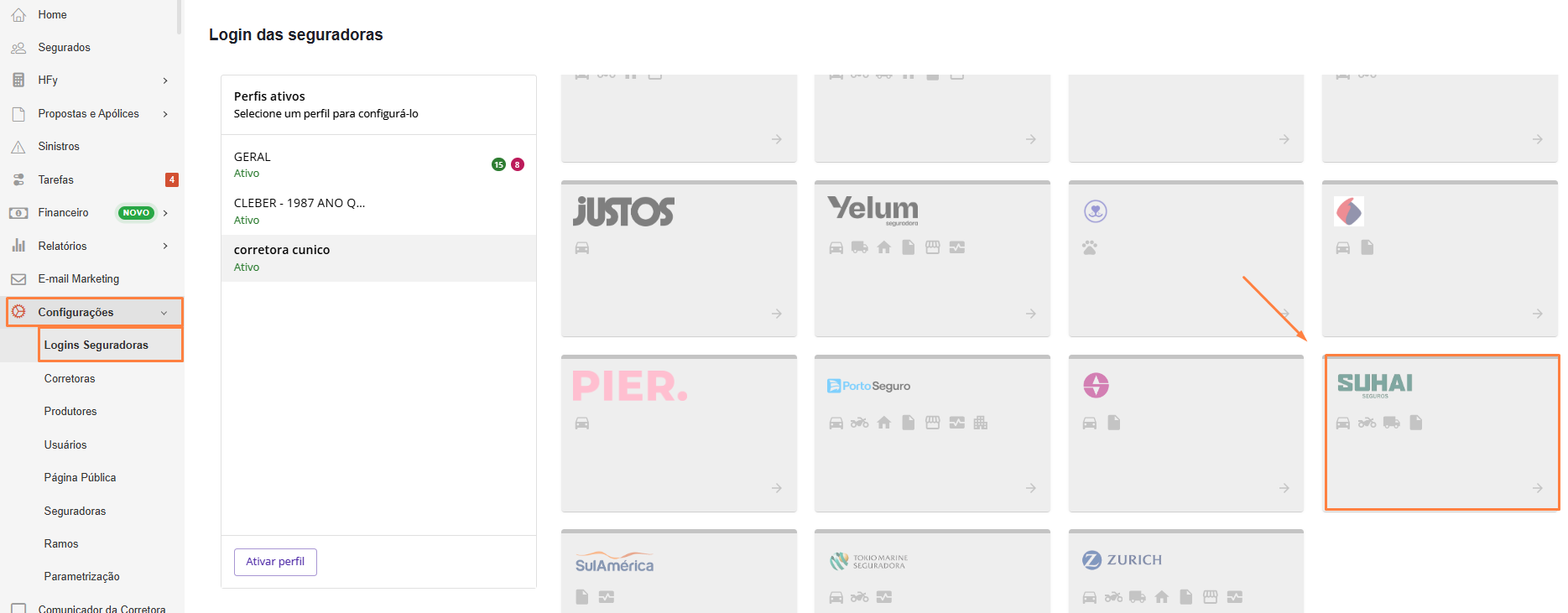 1) Vamos acessar Configurações > Logins Seguradoras > clique sobre a Suhai: