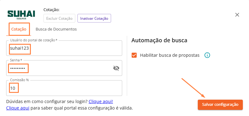 Preencha também o percentual de comissão e habilite a busca de propostas. Em seguida, clique em “Salvar configuração”