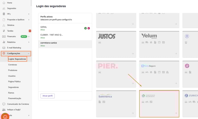 1) Para configurar o login da seguradora, acesse Configurações > Logins Seguradoras > clique sobre a Tokio