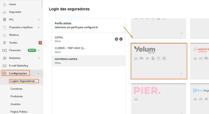 1) Acesse Configurações > Logins Seguradoras > Yelum: