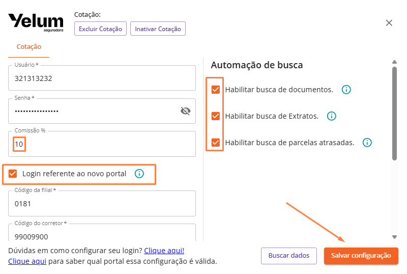 4) Marque a opção de Login referente ao novo portal, preencha o percentual de comissão e habilite as automações de busca. Feito isso, clique em “Salvar configuração”