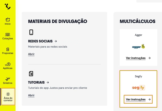 2) Para consultar o seu Código do Corretor, acesse a sua Área do Corretor, localize a Segfy e clique em "Ver instruções"