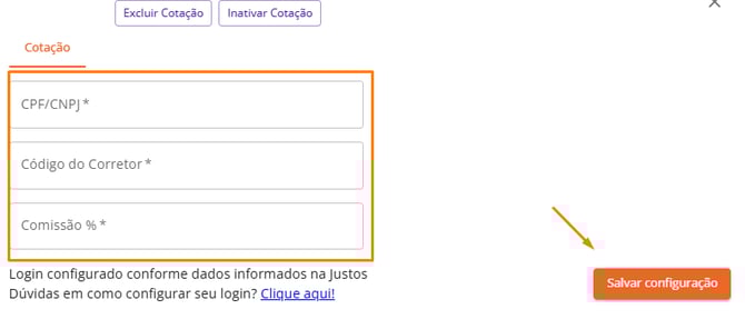 1) Para configurar o login da seguradora, acesse Configurações > Logins de Seguradoras > Justos e preencha o campo com o seu CPF ou CNPJ, conforme o dado que você utiliza para acessar a Justos: