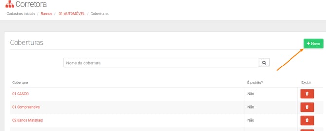 Caso queira incluir uma nova cobertura, utilize o botão verde “+ Novo”: