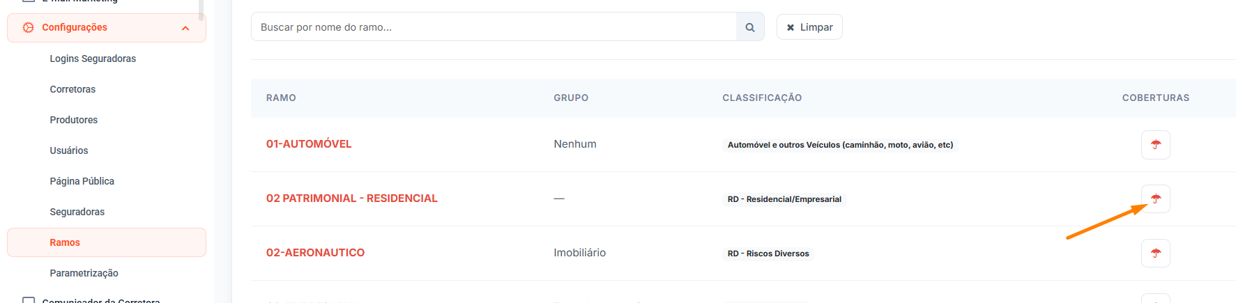 Para inclusão ou edição, basta você clicar em Configurações > Ramos e posteriormente clicar no ícone de guarda-chuva, conforme abaixo: