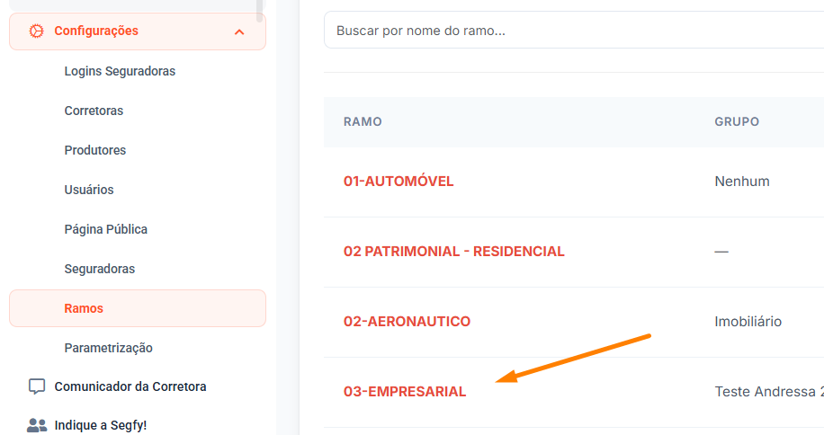 1) Clique em 'Configurações > ramos' e clique sobre o ramo desejado: