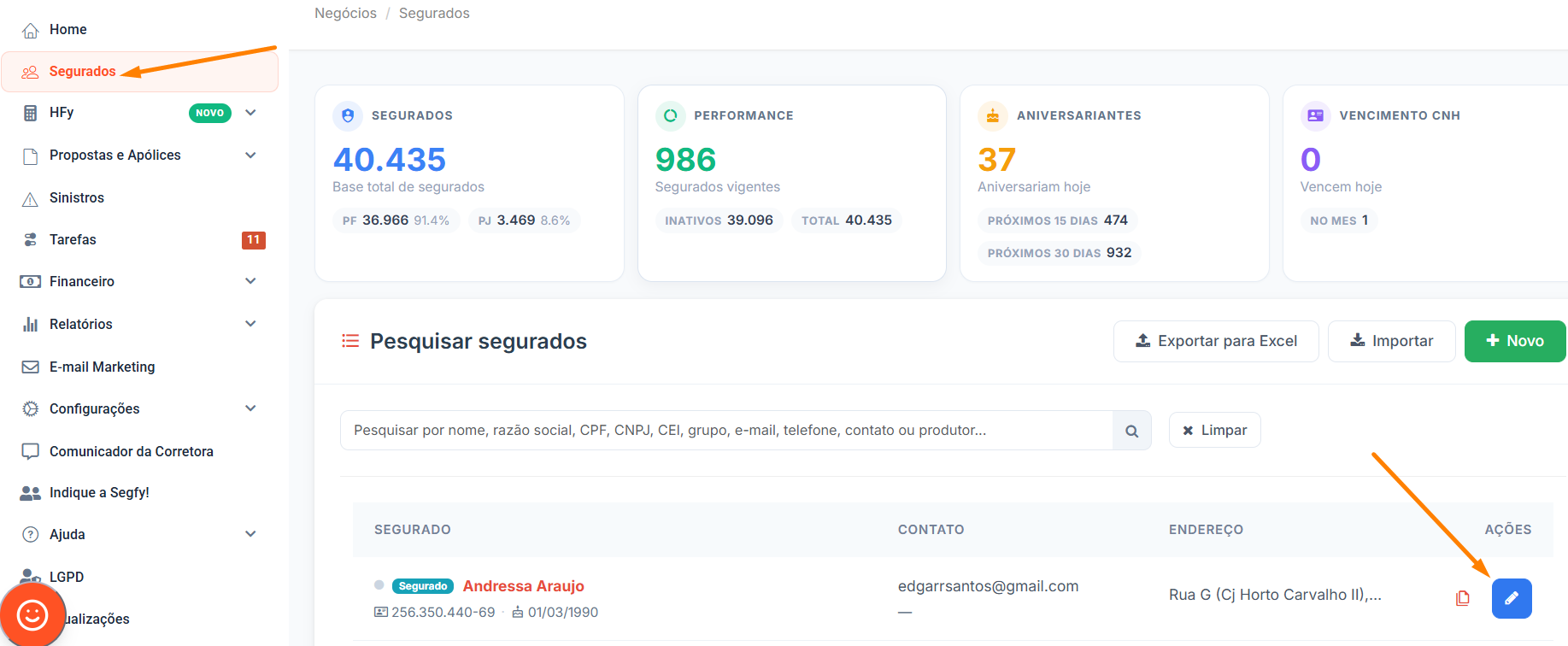 1) No menu lateral esquerdo clique em 'Segurados' > Localize o segurado > Lápis azul: