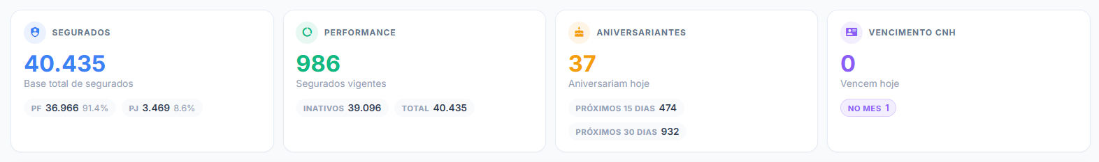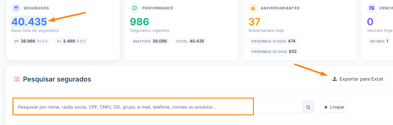 2) Você pode filtrar seus segurados através dos números presentes no Painel. Ao clicar em alguns determinados números, o sistema filtra e apresenta apenas aquela relação de segurados para você.