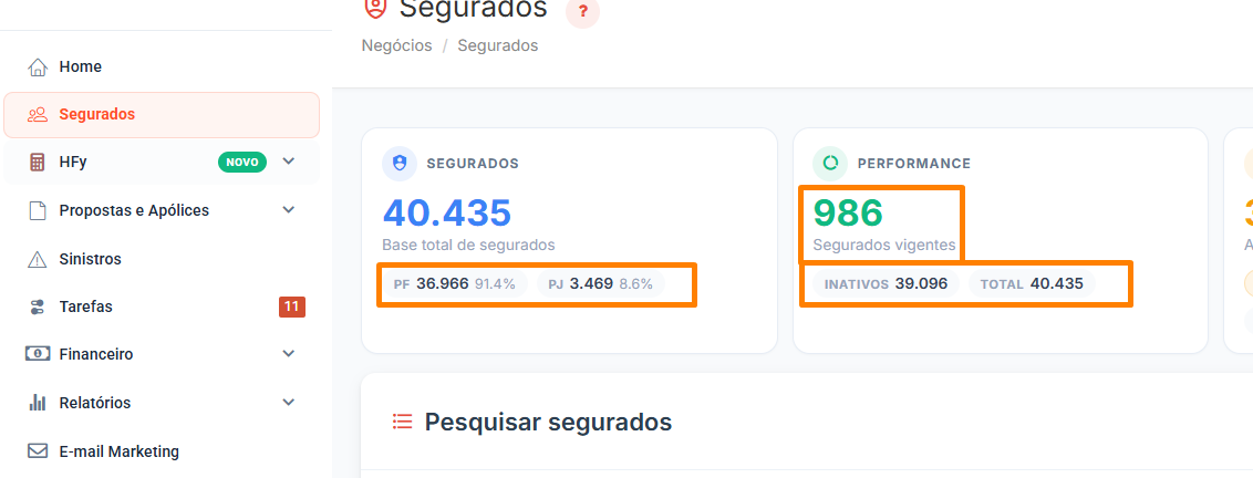 1) Para ter em tela a quantidade de segurados ativos, inativos, pessoa física e jurídica da sua carteira e verificar quais são, clique em SEGURADOS localizado no menu lateral esquerdo:
