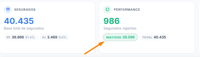 Por exemplo: a tela abaixo mostra a quantidade de segurados vigentes e inativos que tenho até o momento cadastrados no sistema, e, clicando sobre este número, abaixo aparecem quais são: