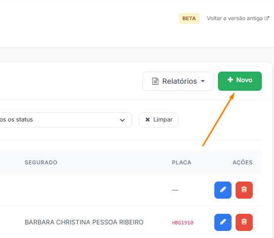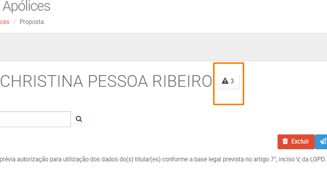 Se ocorreu um sinistro com determinada apólice é possível consultar de duas formas: uma delas é dentro do cadastro, irá aparecer um símbolo alerta informando o número de sinistros: