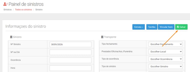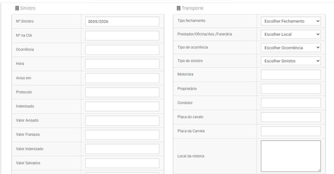3) Preencha os dados desejados, como Número do Sinistro, Valor, Oficina. Esses campos não são obrigatórios, porém, quanto mais informações, melhor: