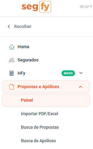 1) No menu lateral esquerdo, clicando em Propostas e apólices > painel, é possível buscar a apólice desejada.