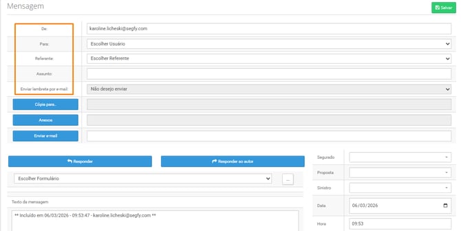 5) Preencha os dados como "Para", "Referente", "Assunto", "Texto da mensagem" e informe o dia e a hora que deseja agendar essa tarefa e verifique se o segurado já está vinculado e clique em “salvar”: