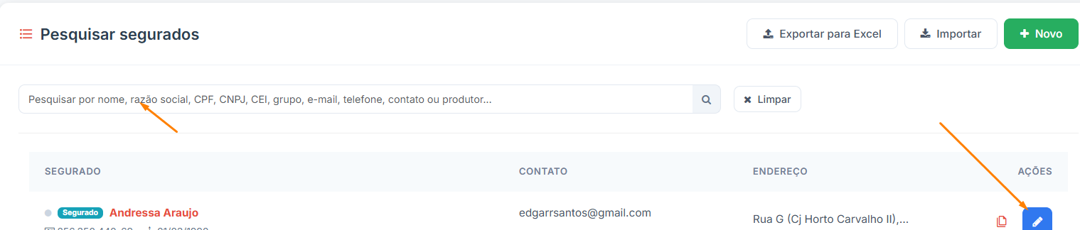 2) Pesquise o segurado e clique no lápis azul para acessar o cadastro