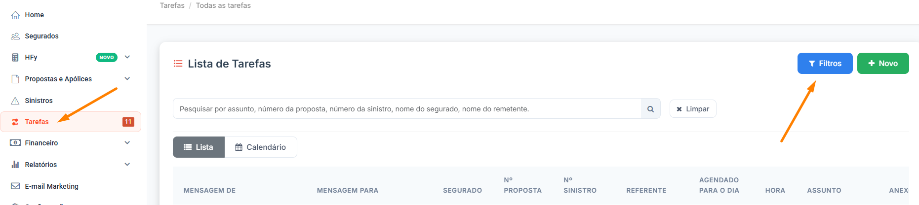 1) Acesse no menu lateral esquerdo em 'Tarefas' e depois clique em '+Filtros'